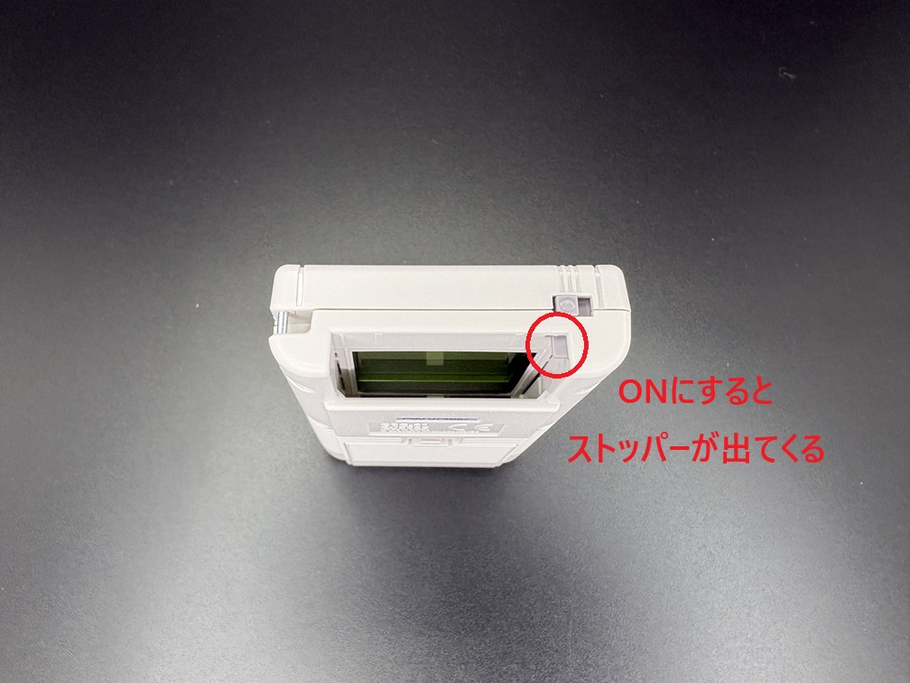 上から。上には電源ボタンがあります。実際のゲームボーイにも同様の場所に電源ボタンがありましたね。電源を入れるとカードリッジが抜けなくなるようにストッパーが出てきます。実際のゲームボーイでも同様の仕様でしたよね?昔すぎて記憶が曖昧ですが。
