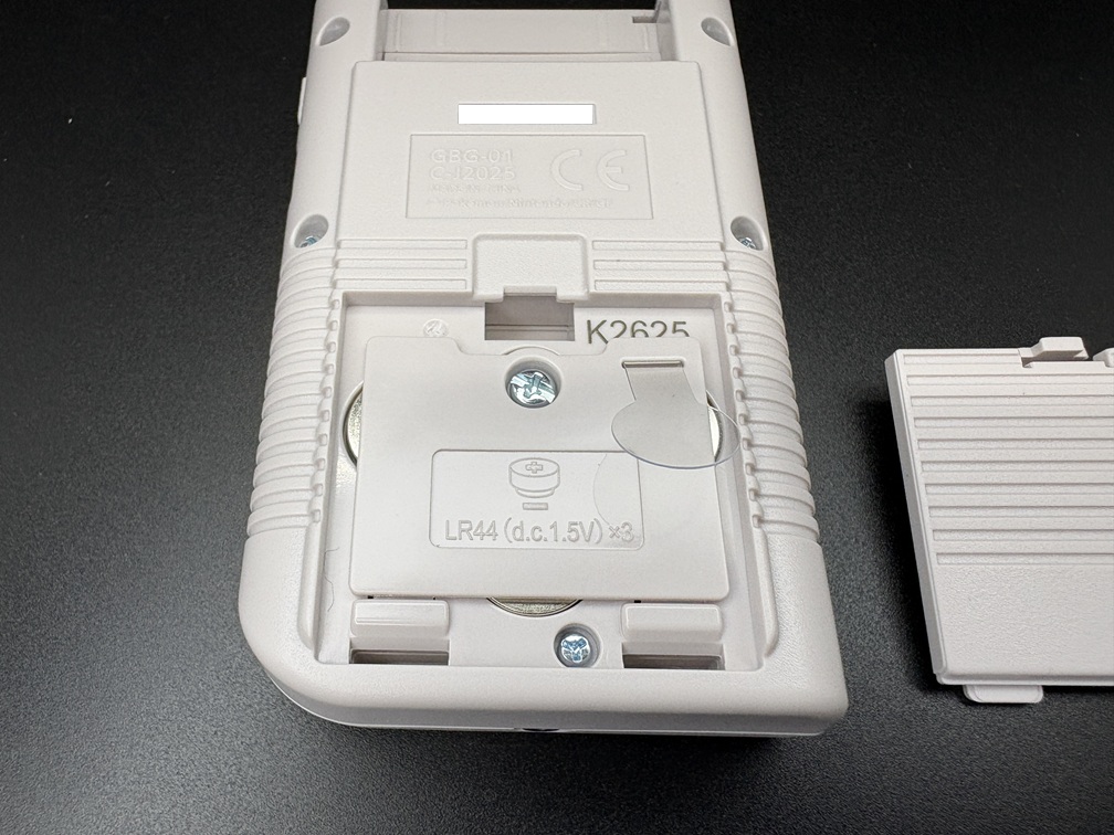 そして裏側には電池カバーがあり、外すと中にもう1枚ネジ付きでカバーがあります。使用する電池の刻印もあります。使用する電池は「LR44」というボタン電池を3個使用します。