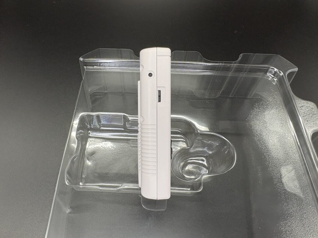 左右から。左右には画面の色の濃さを調整するロータリースイッチ、ボリューム調整のロータリースイッチ、通信ケーブルを差し込む場所もカバーが付いた状態で再現されていますが、いずれも動きません。ちなみに正面のABボタンなども動きません。動かせないものの細かい部分まで再現されています。