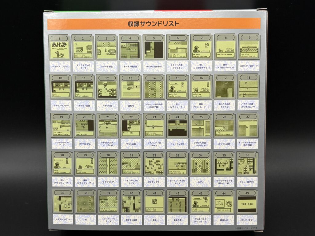 背面には各番号と曲名、その曲が流れるときのシーンが印刷されています。外箱の底に印刷されていたものと同じですね。
