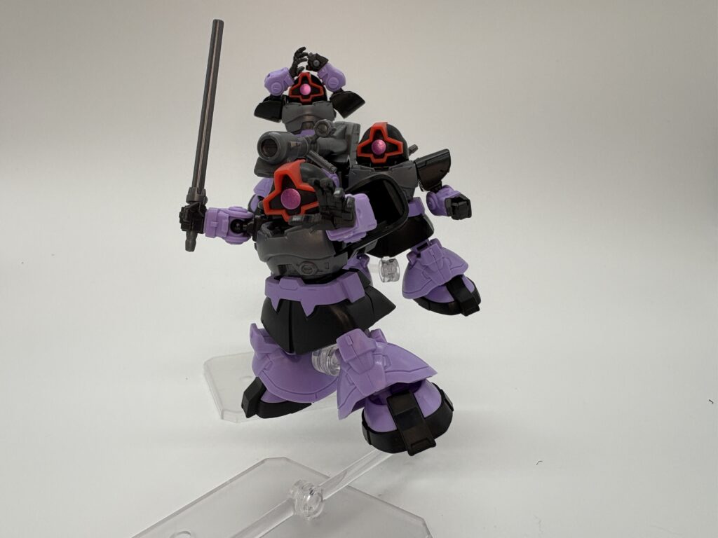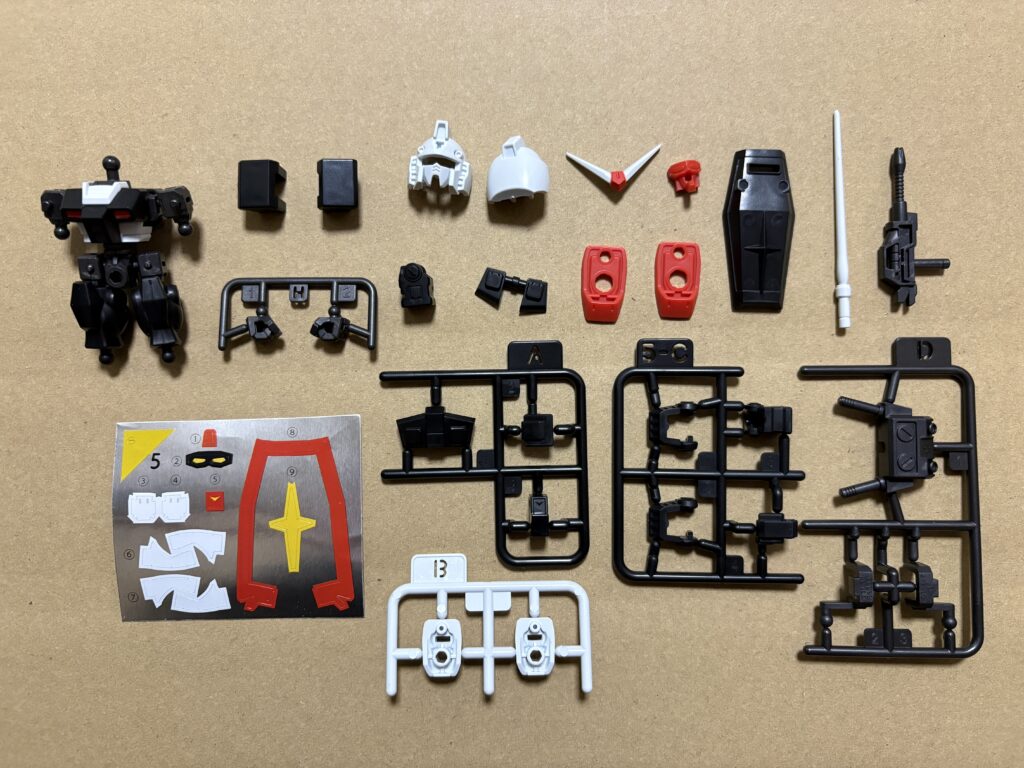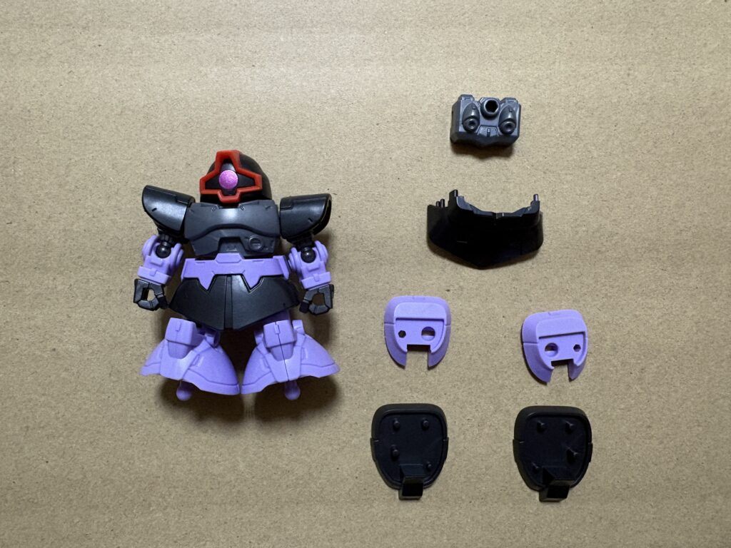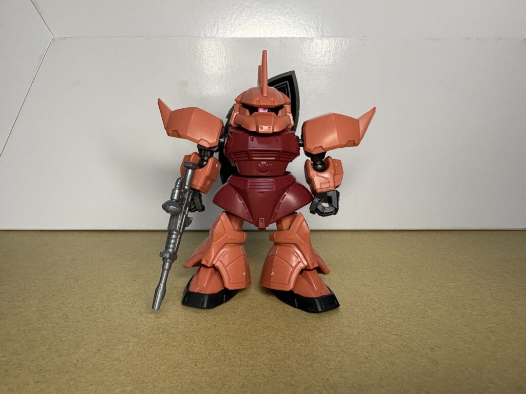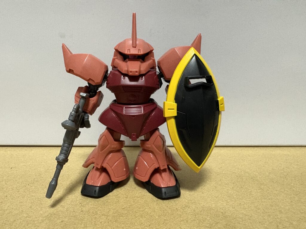 パッと見てシャアの機体だと分かりますね。頭部を自分で組み立てるため、ドムよりもパーツ点数が多くなっています。