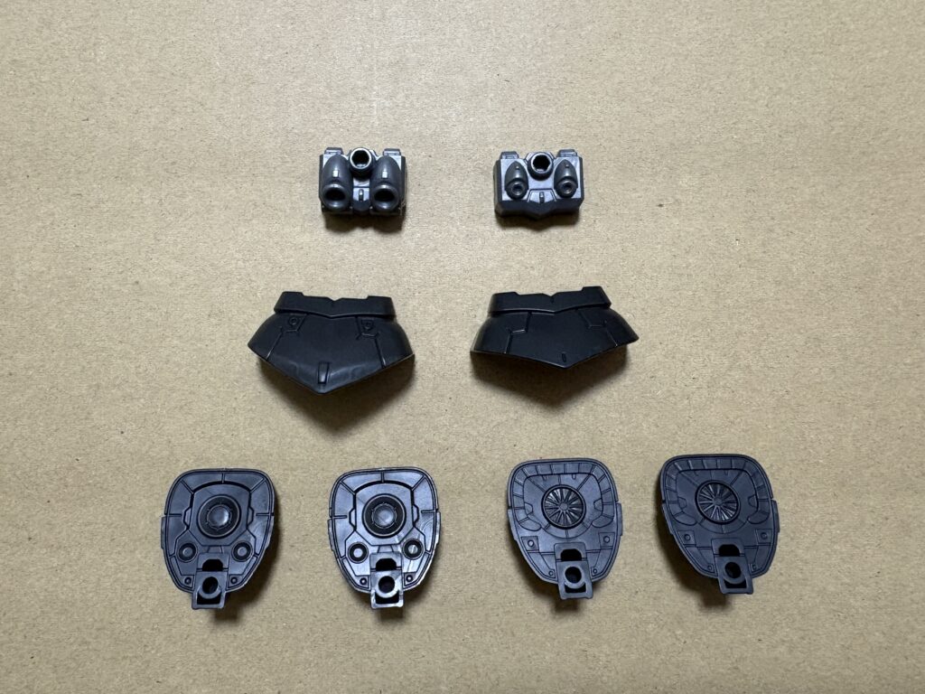 サクッと組み立て完了!シールドをマウントするパーツは右腕用、左腕用の2種類が付属して、シールドも2枚あるため両腕に取り付けることも可能です。