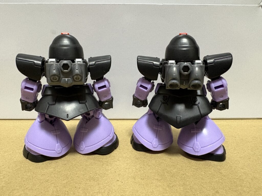 体格はモビリティジョイントの方がガッシリしていますかね。体の横幅があるからでしょうか。全体的なバランスは、モビリティジョイントの方が好みかもしれません。アンサンブルシリーズは、関節や胴体の後ろ側の部品はほぼすべてのモビルスーツで共通部品になっているから仕方ないかもしれませんね。