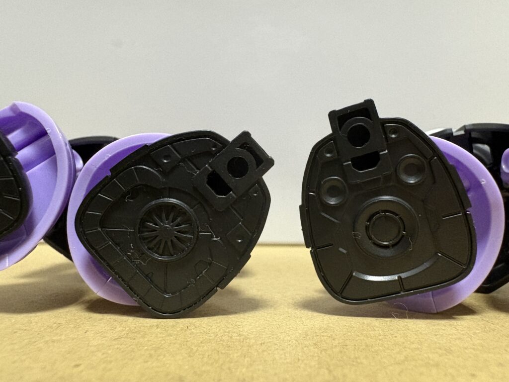 色分けはアンサンブルのほうが細かいですね。左胸の黄色、腰の紫の部品のリヤ、膝の黒い部品がアンサンブルでは色分けされており、モビリティジョイントでは色分けできていません。