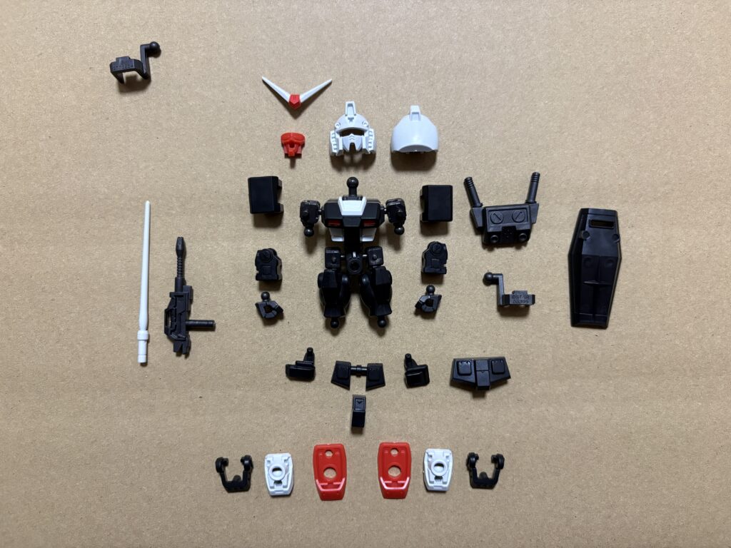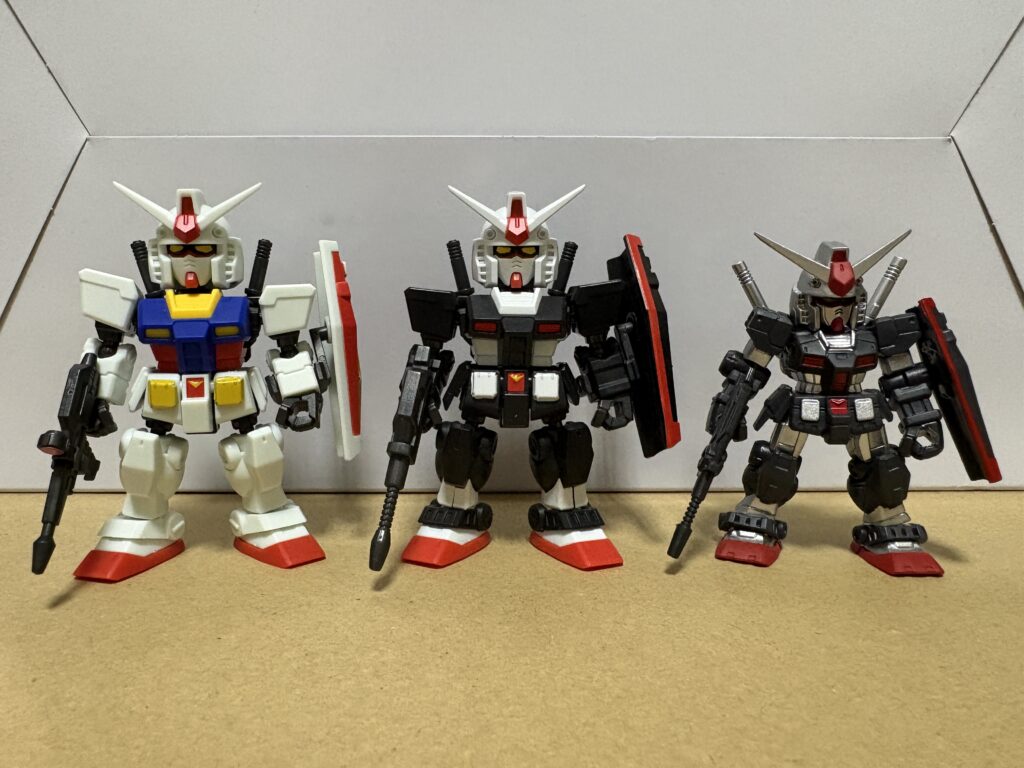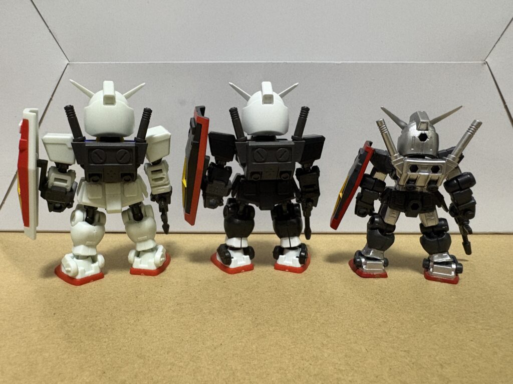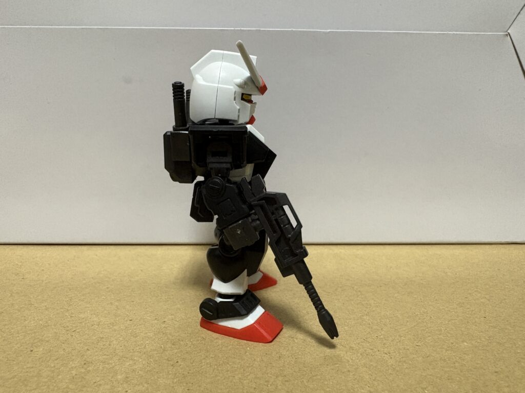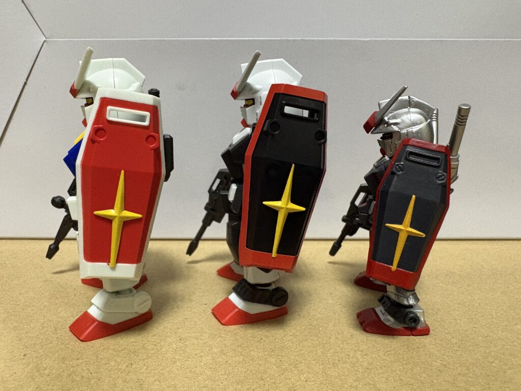 今回のラインナップのガンダムと比較すると、白はガンダムが若干青っぽさがあるというか、純粋な白ではないですね。反対にプロトタイプガンダムは【キレイな白!】って感じです。形状の違いはビームライフルと左右の腕、右のサイドアーマー、足のアンクルアーマーですね。