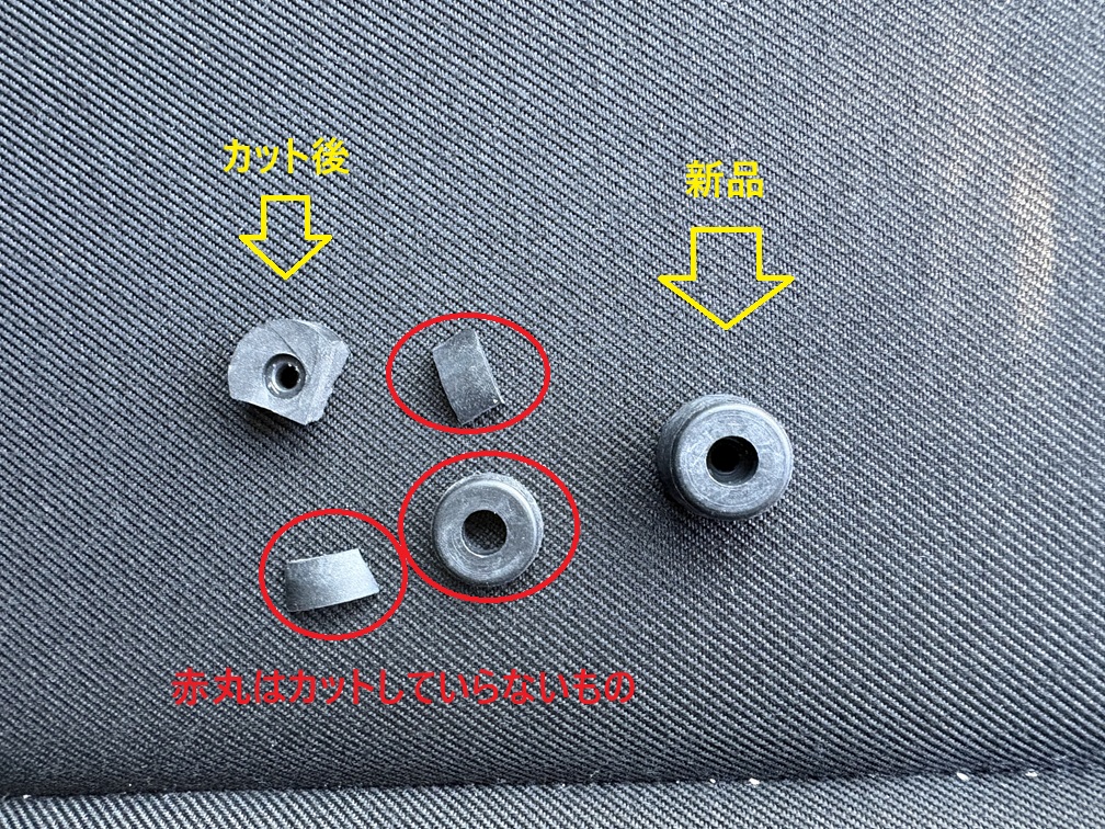 ・・・切りすぎました(笑)切りすぎたため軸に嵌らなくなりました。ここで飛び出している軸が約3mmなのを思い出して、脚ゴムの方も約3mmにすればいいと思うのでカットする量は約2mmぐらいにしてみました。