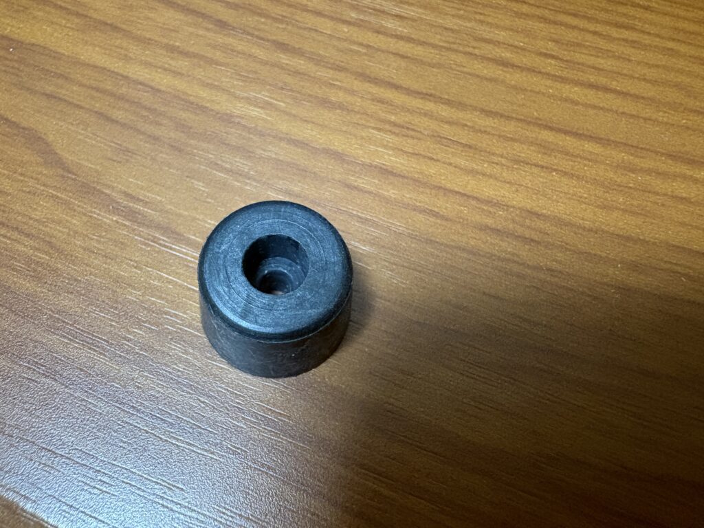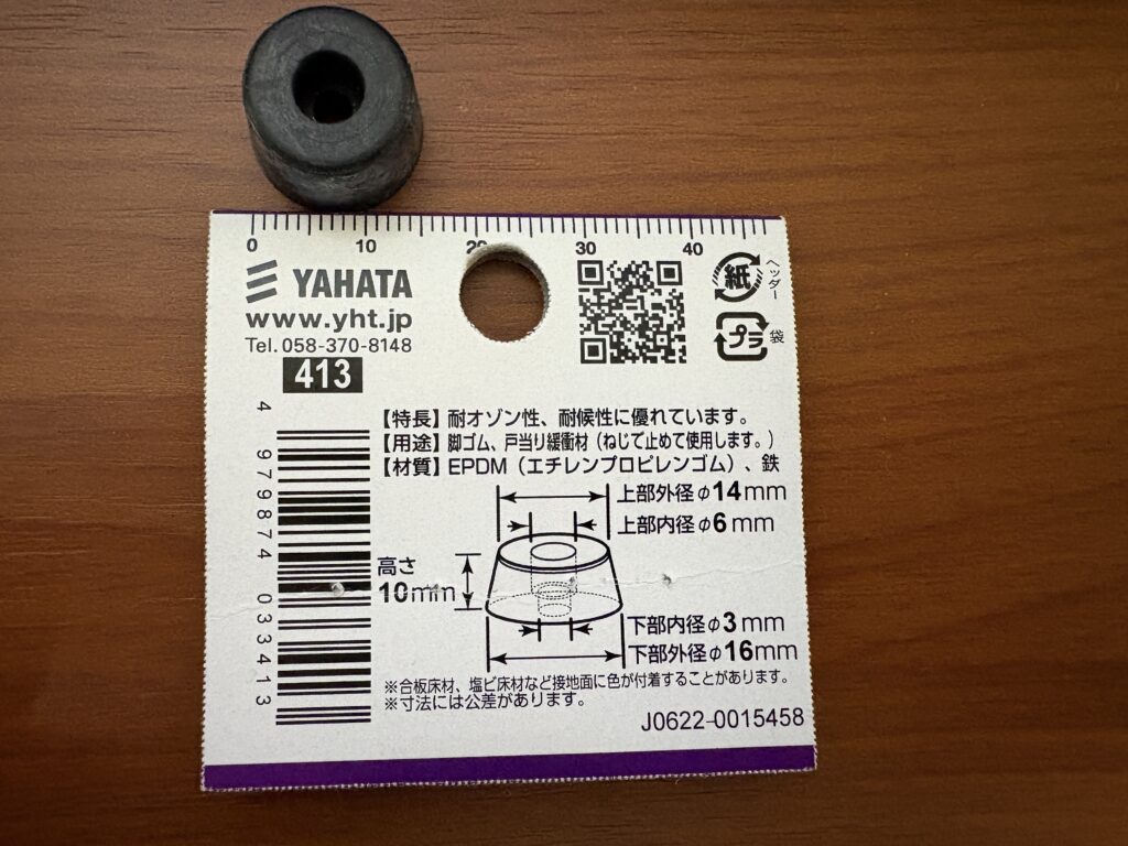 右側は、脚ゴムや戸当たり緩衝材として使われるゴムですね。中央に穴が開いており、その穴がちょうど中間の5mmところで段になっています。ねじ止めで使用するものですね。