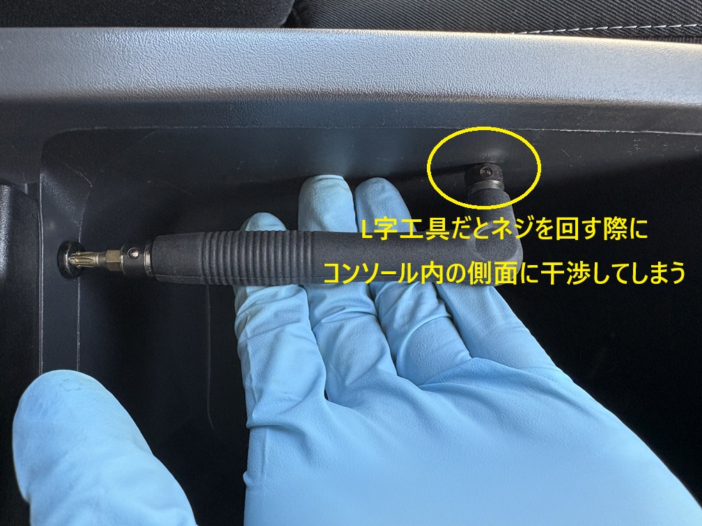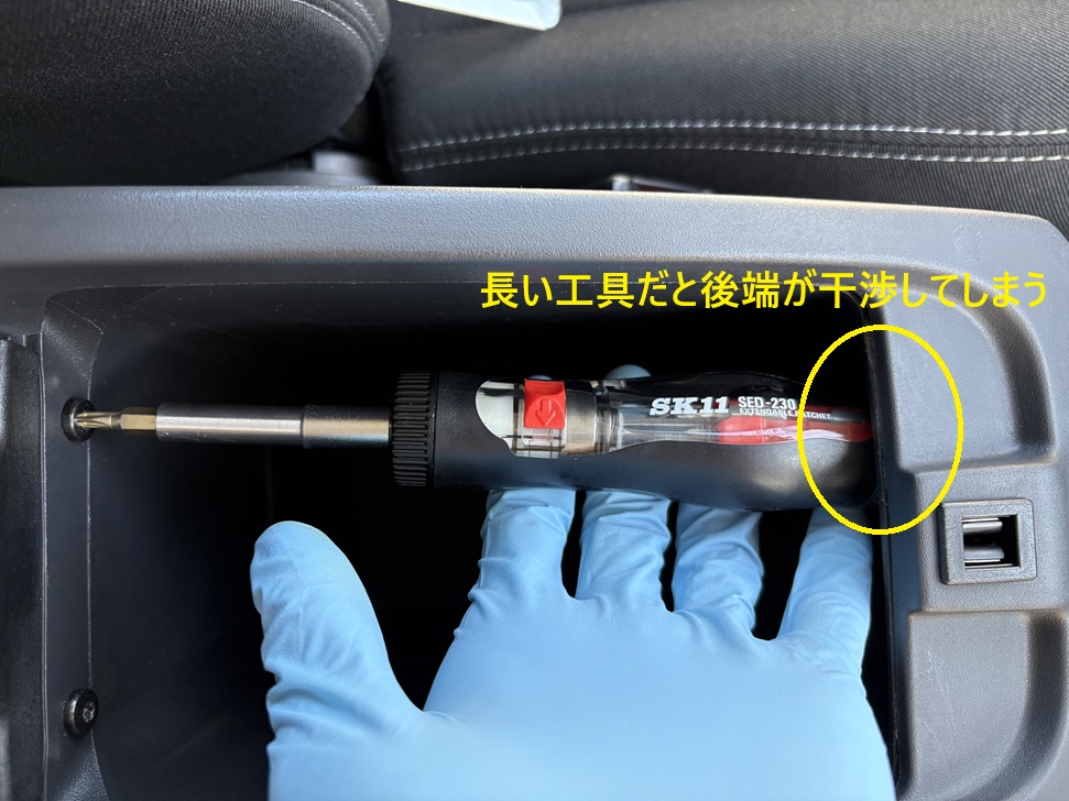 使用する工具に2つの注意点があります。一つ目は、あまり長い工具だとネジを回しにくくなってしまうので150mm程度の長さの工具がオススメです。コンソールの先端側にあたってしまうんですよね。
