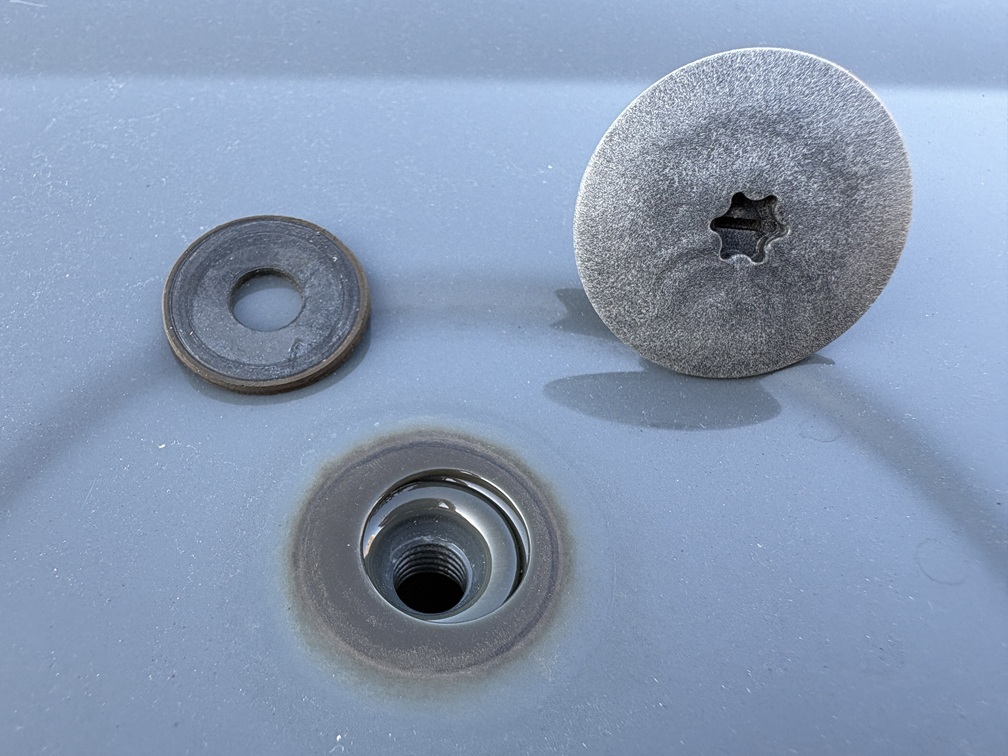 特に締めるときに感覚が分からず、強く締めすぎてしまうとボルトの山を潰してしまいます。ええ、私は1か所潰しましたよ(笑)潰してしまうとルーフボルトは破損してしまい、車両側のネジ山も修正しないといけなくなります。