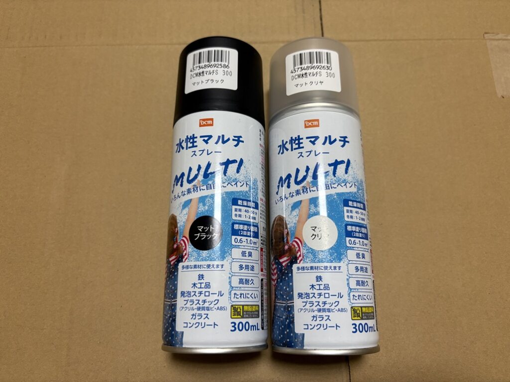 使用した塗料は、ホームセンターのオリジナルブランドの「DCM 水性マルチスプレー」になります。今回の塗装のために購入したものではなく、家にあった使用途中の物で済ませました。