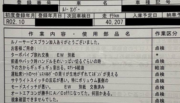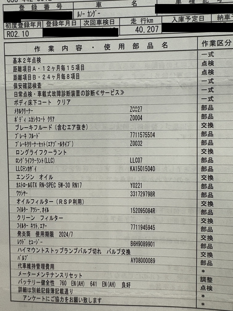 私のカングーは新車で購入してから5年が経過し、車検が10月なので2回目の車検を受けてきました。