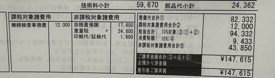 部品代が値上がっているにもかかわらず、1回目と2回目で【部品代小計】がほとんど変わらないのは、下回りの洗浄・塗装の金額の出し方が2年前と変わっているためでした。この項目だけは反対に2割程度安くなっていましたね。謎です(笑)