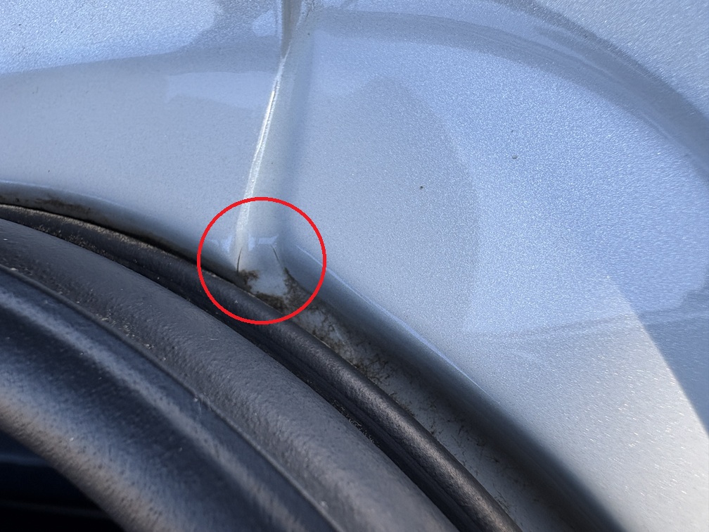 それはズバリ塗装割れです。場所はリヤガラスを開けたところのルーフとリヤフェンダーのつなぎ目になる場所です。