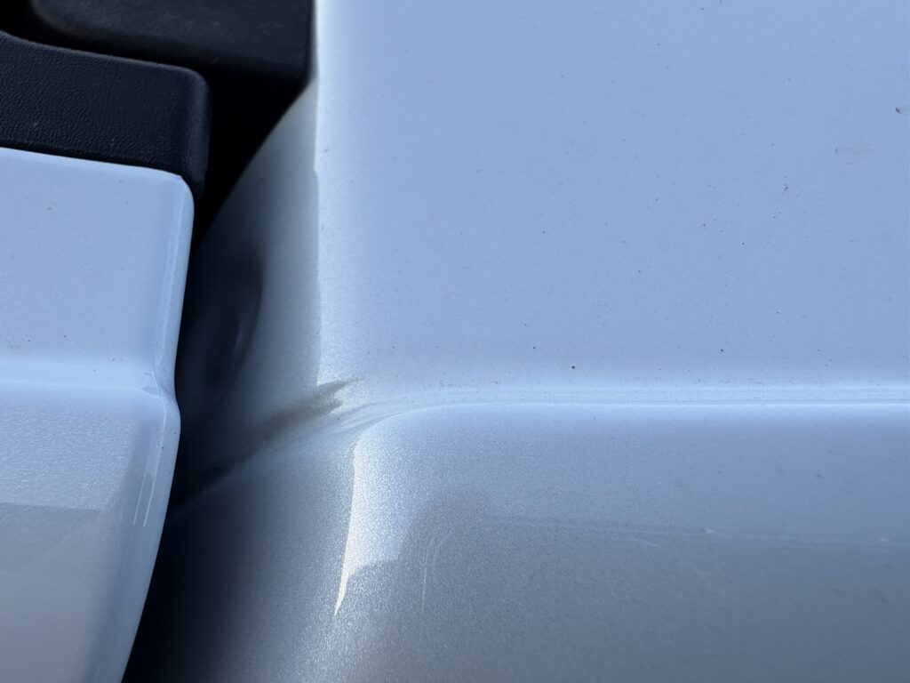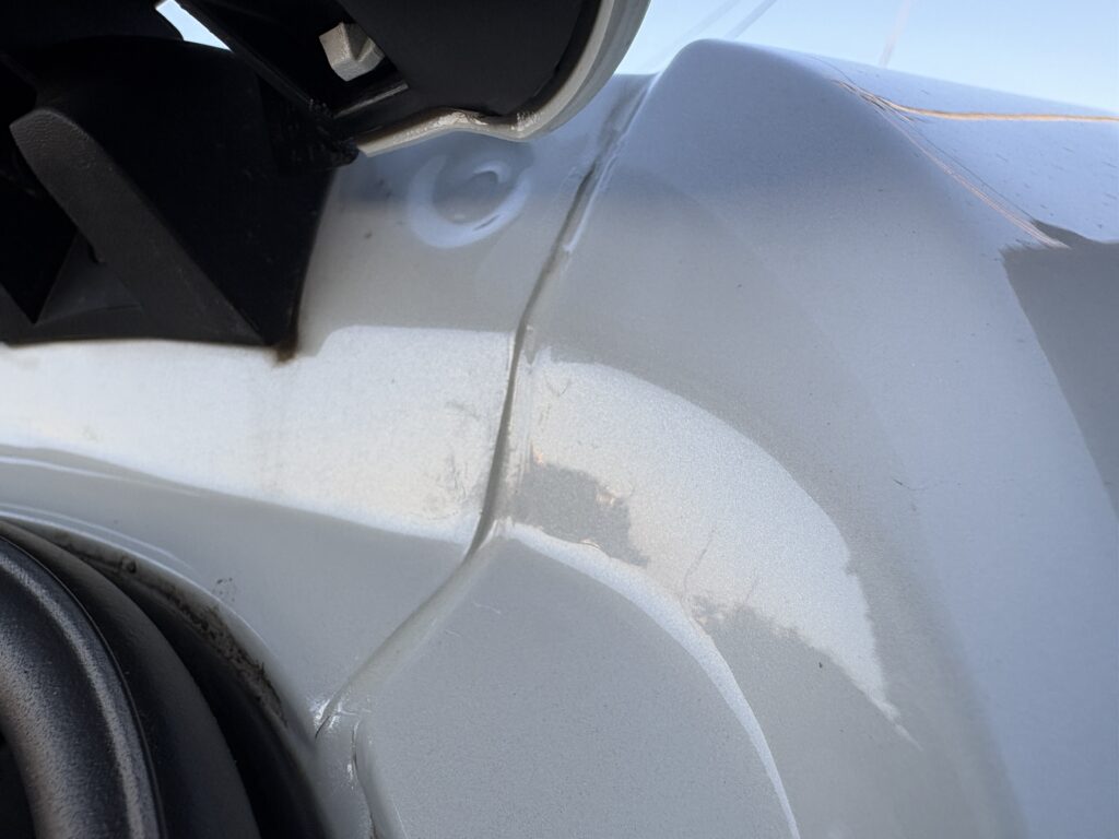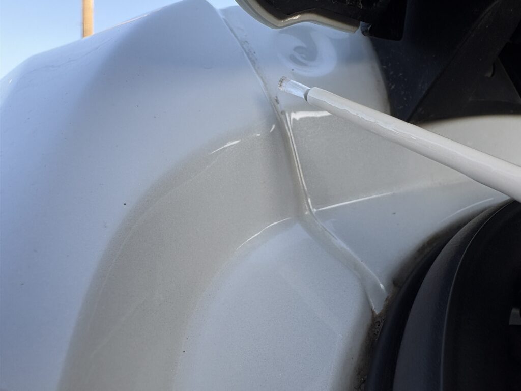 ちょうどディーラーに行く用事があったので撮った写真を見てもらったところ、このトゥインゴではあるあるみたいですね。そのままだとヒビが広がってしまうかもしれないので、タッチペンで塗っておいてくださいと言われました。