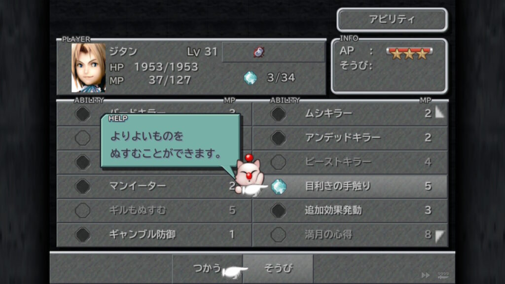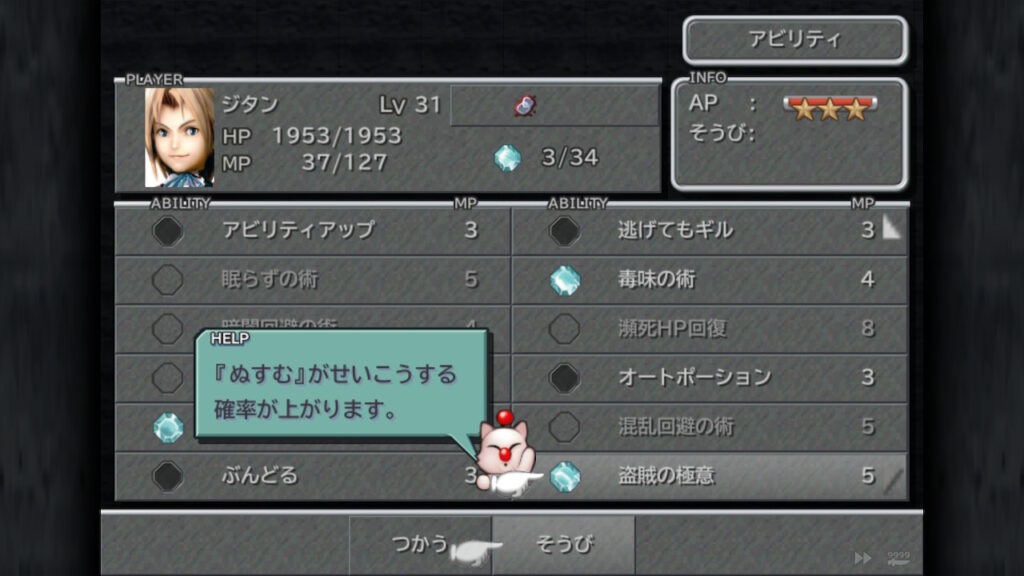 ジタンのレベルや気力が高ければ盗める確率が高くなることが分かりますね。反対に上記のように初期の状態だと、盗めはするものの失敗する確率が高いことが分かるかと思います。