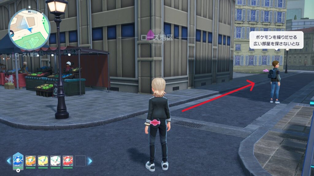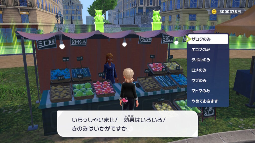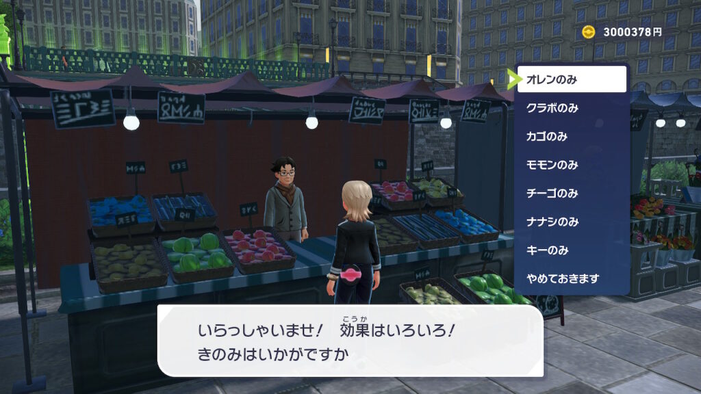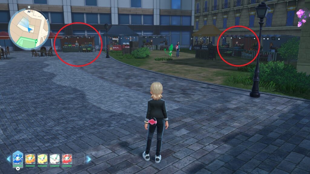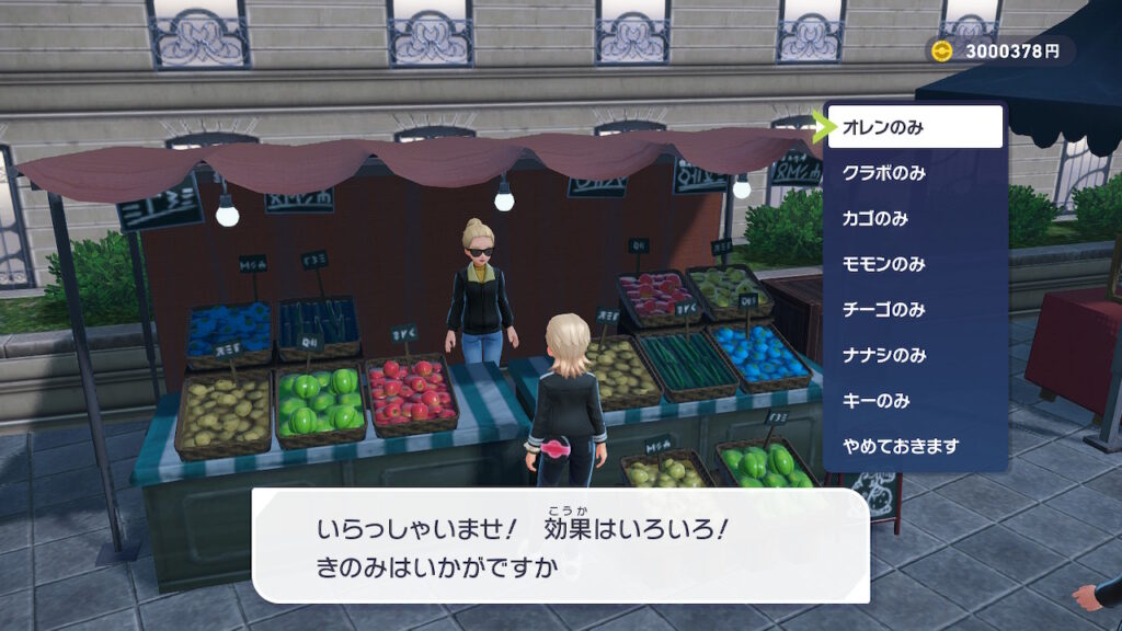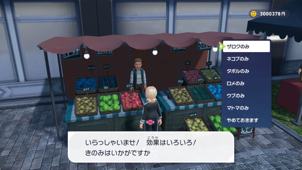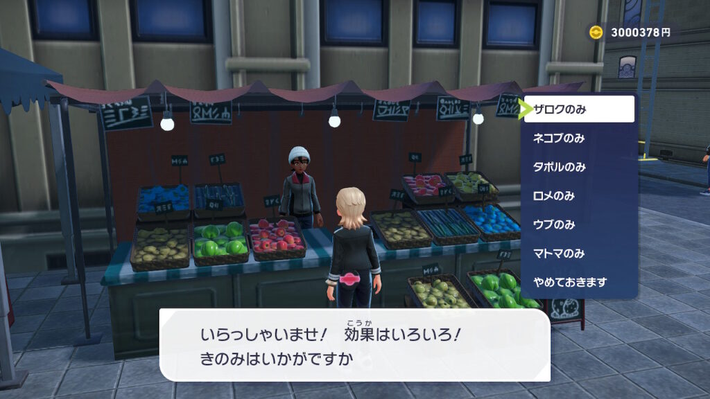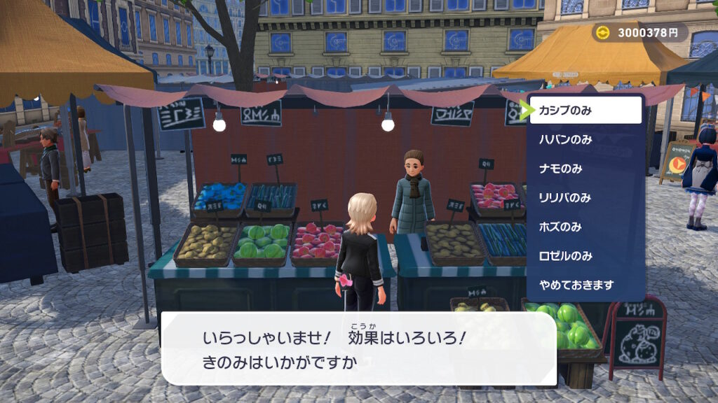マップから「ポケモンセンター:ローズ」へ移動し、カメラをほぼ180度回転させると2軒のテントを確認することができますが、そのうちの左側のテントがきのみを販売しています。