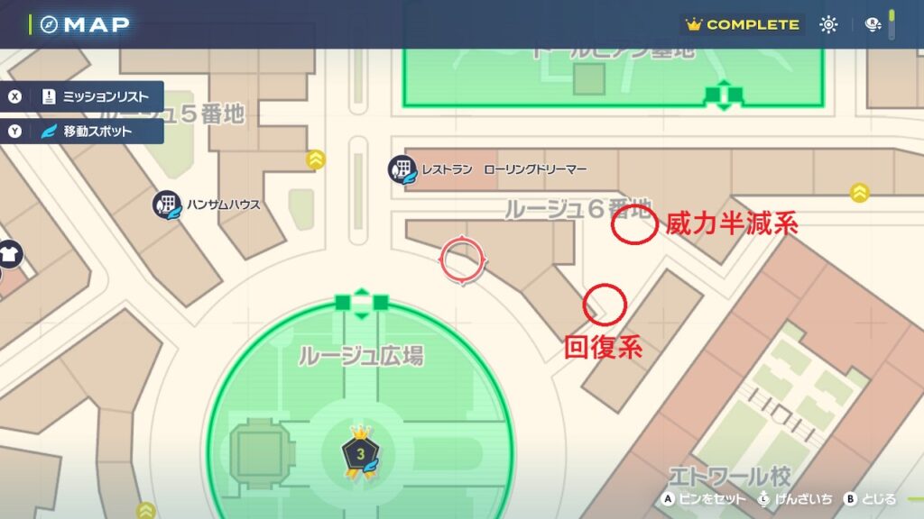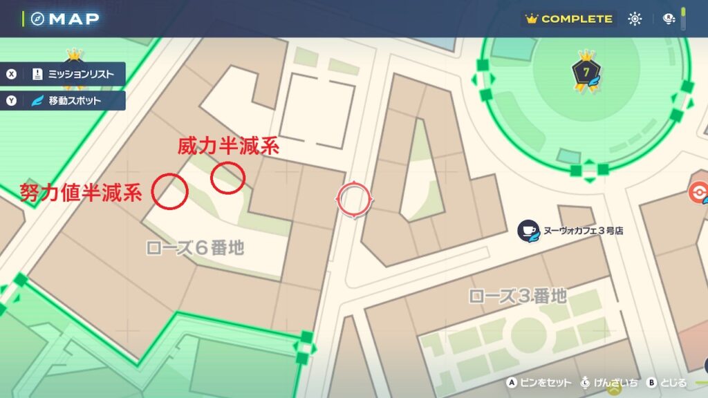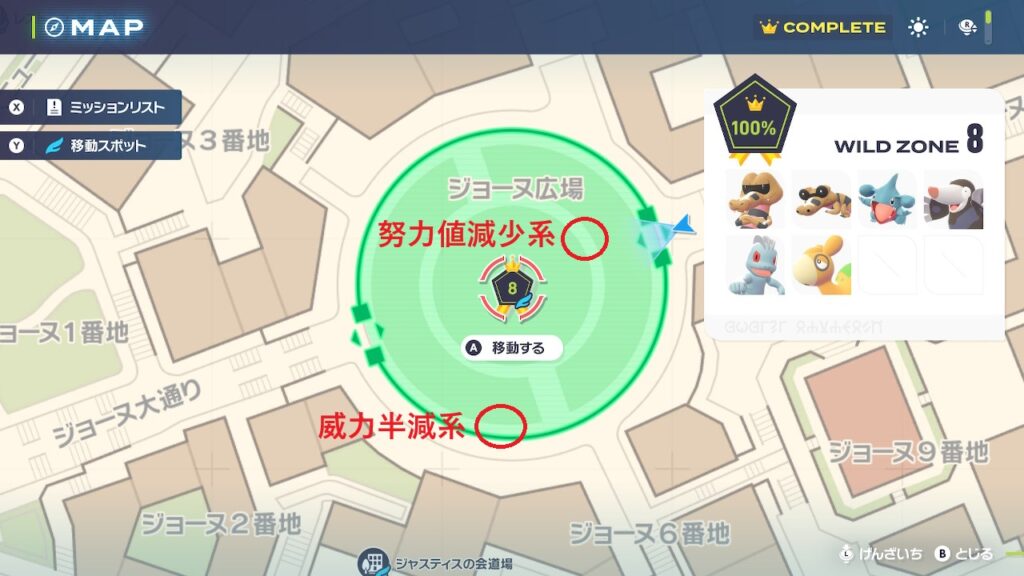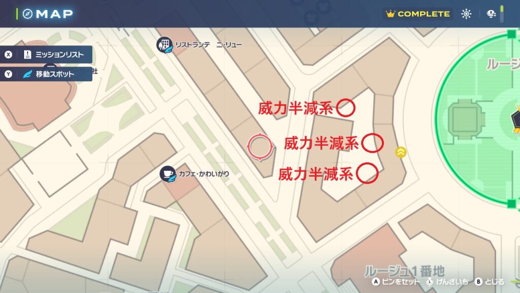 威力半減系は全て取り扱っている「ワイルドゾーン3の左側の広場」がオススメです。厳密に販売場所までの距離や時間を測定するとそれぞれ別の場所へ行った方が早くなりますが、それでも5秒も変わらないぐらいです。