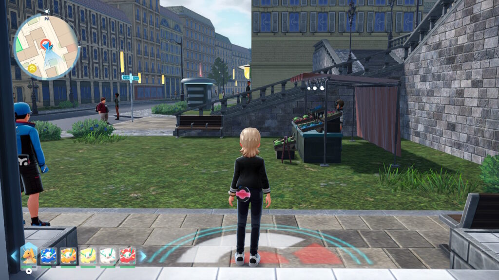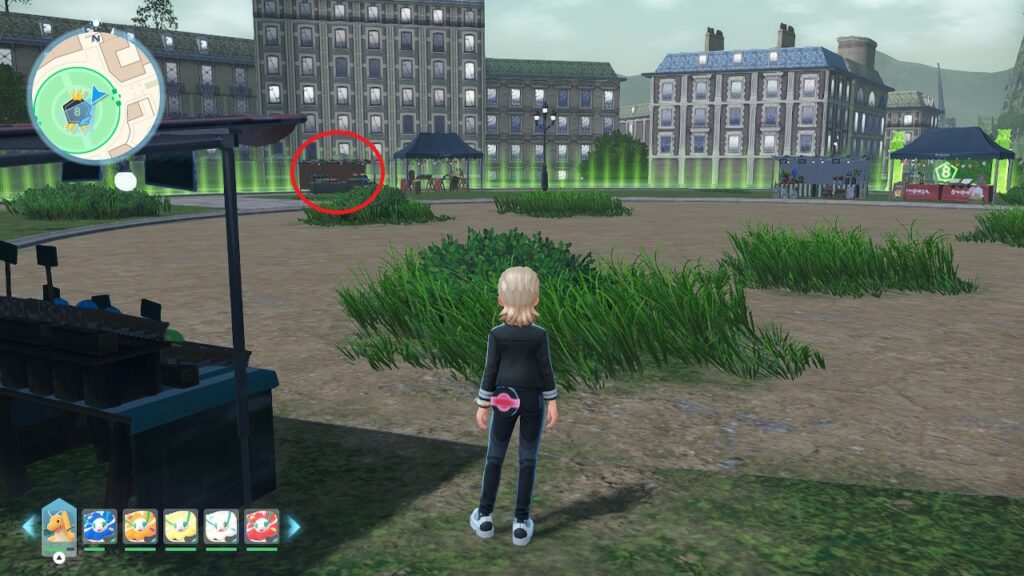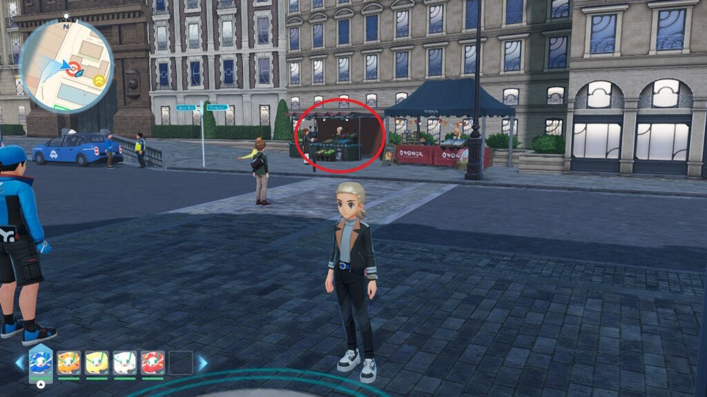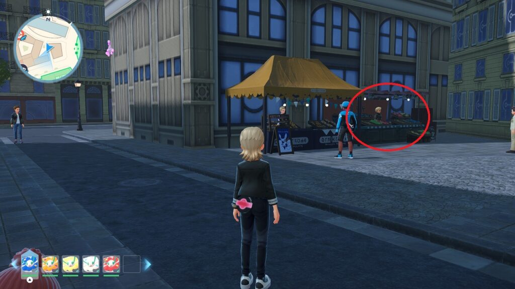 マップから「ポケモンセンター:ジョーヌ」へ移動し、カメラを180度回して後ろを向くと販売しているテントがあります。