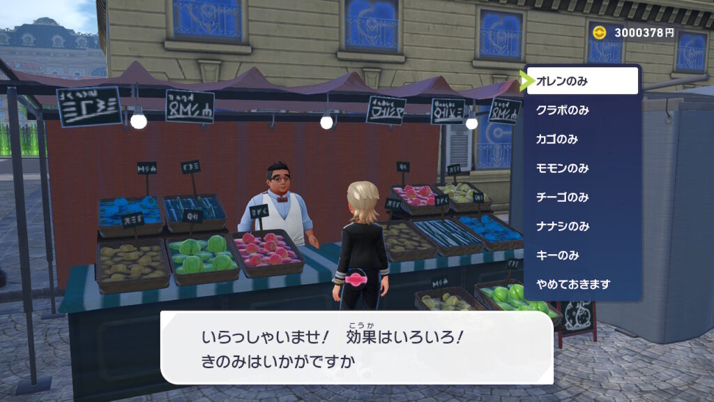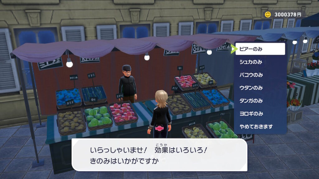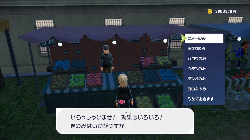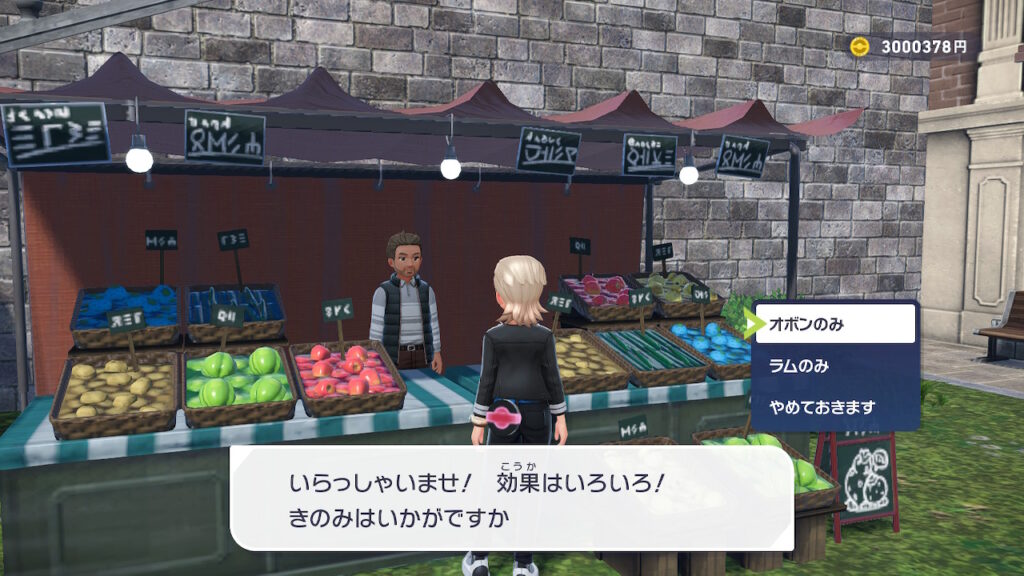 こちらのおじさんが販売しています。取り扱いは「オボンのみ」「ラムのみ」以外回復系です。