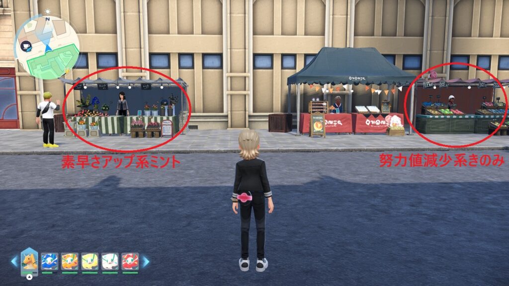 努力値減少系のきのみを販売している場所からカメラのみを右へ動かしていくと、きのみを販売しているもう1か所のテントが見えます。下の画像の赤丸です。出入口ではないほうのテントになります。