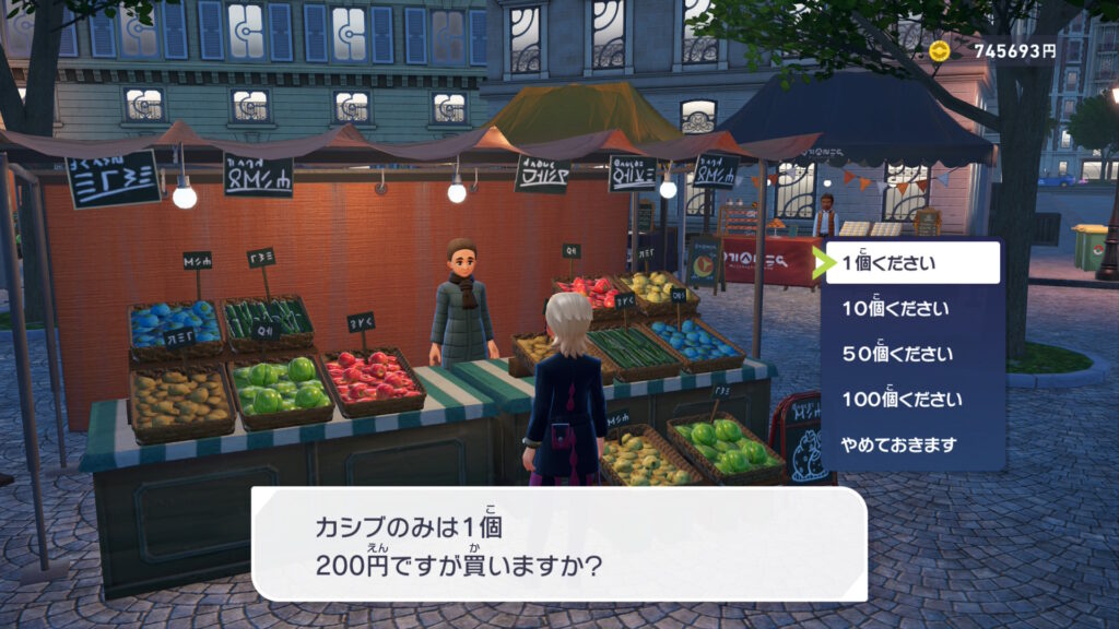 気が済むまで購入しましょう。今後のアップデートで購入できる個数を決められるようになったらいいんですけどねぇ。これはZAのマイナスポイントです。※2026年1月22日に配信された更新データ(Ver.2.0.1)をダウンロードすることによって、きのみの購入時に4種類から個数を選択できるようになり、最大で100個の購入ができるようになりました。