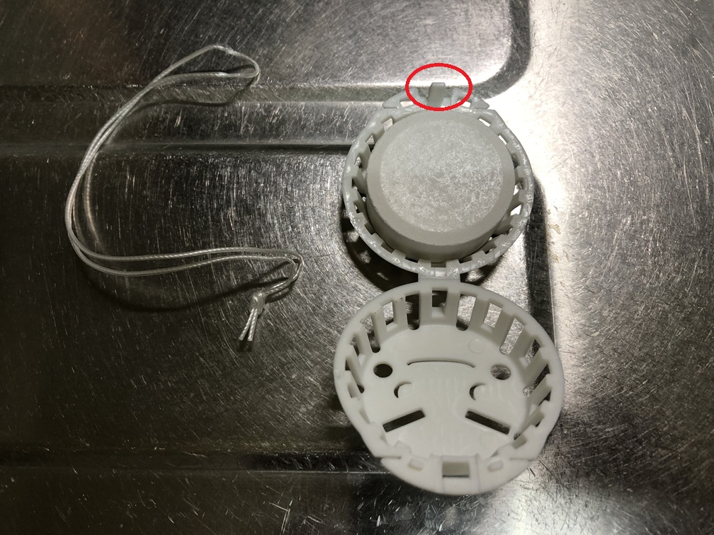 そしてこちらが取り換えるカートリッジです。こちらの商品は単体でも使用できるようにヒモが付いていますが、私には不要なのでヒモは取り外します。下の2枚目の画像の赤丸のツメを押しながらパカッと開けば簡単に取り外せます。錠剤も確認できますね。